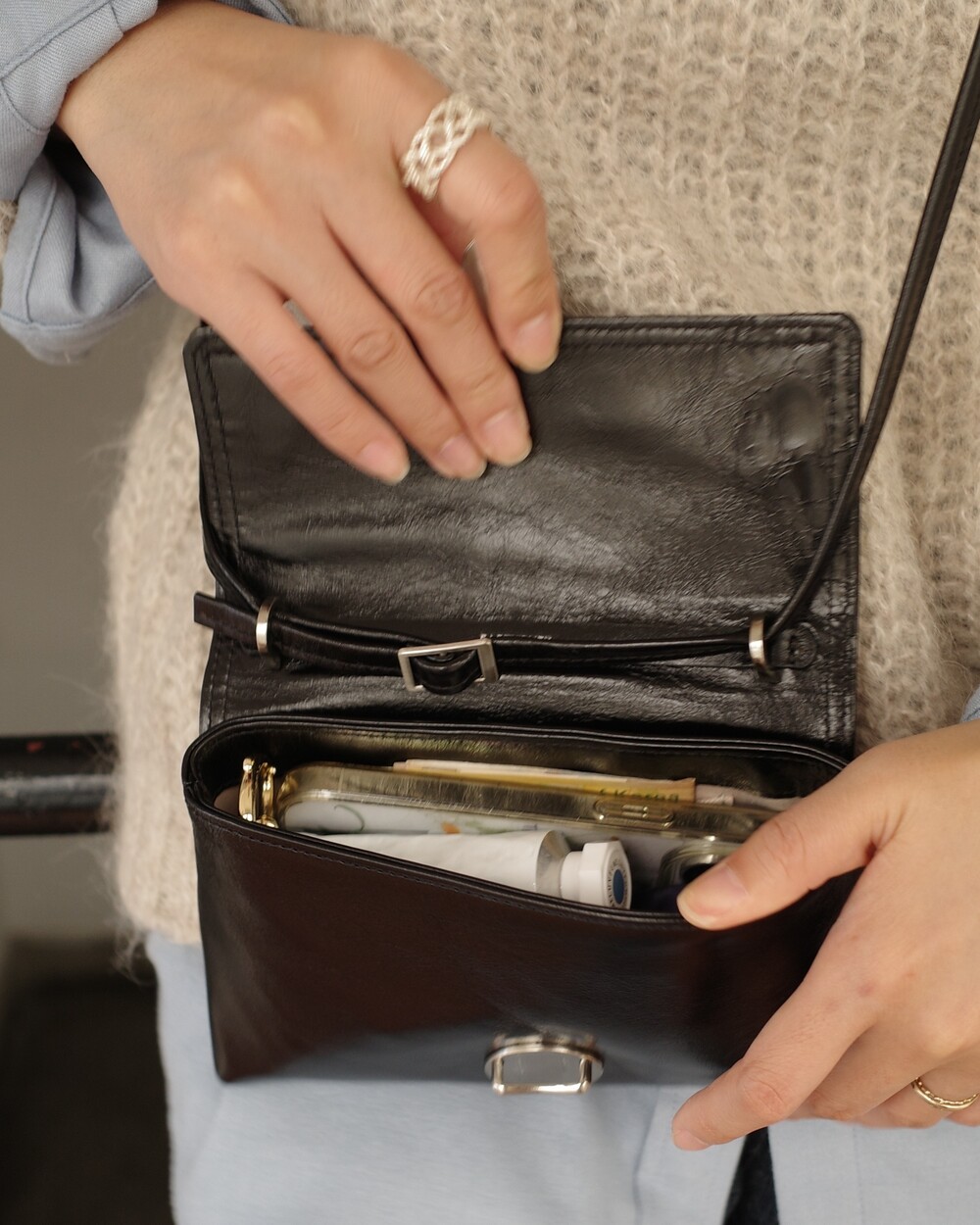 사용시 가죽가방을 딱딱하게 변성시킬 수 있습니다.